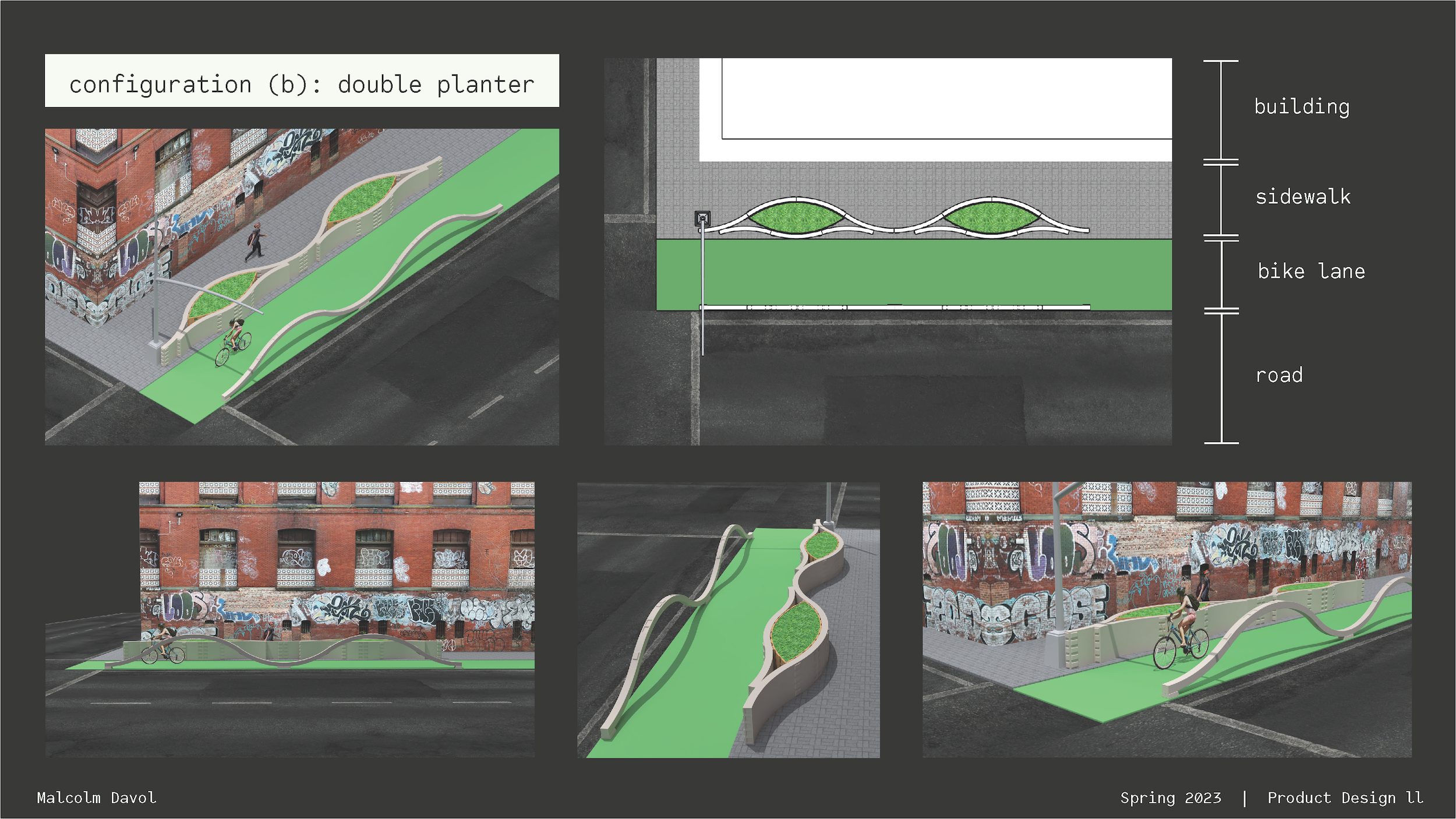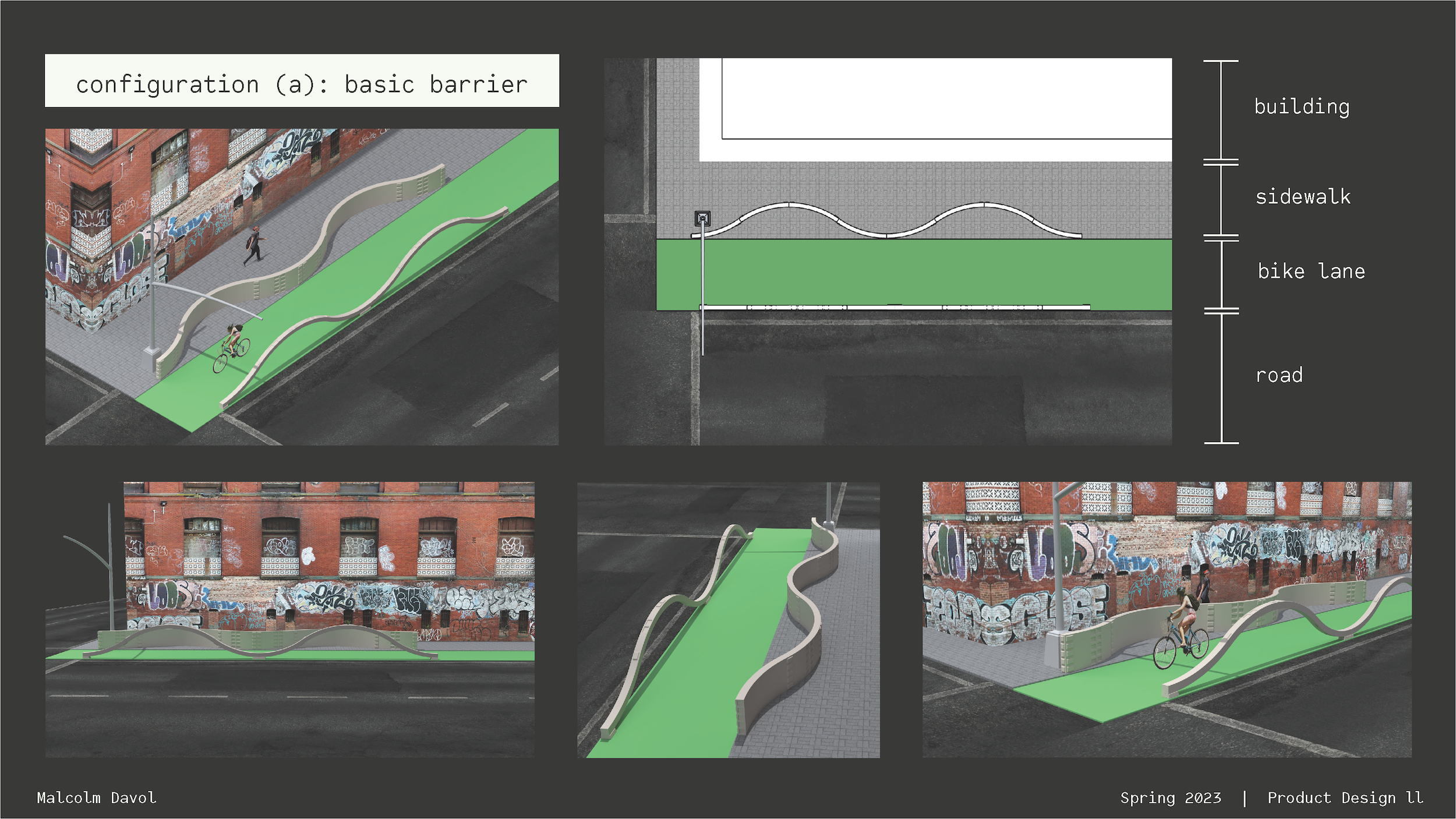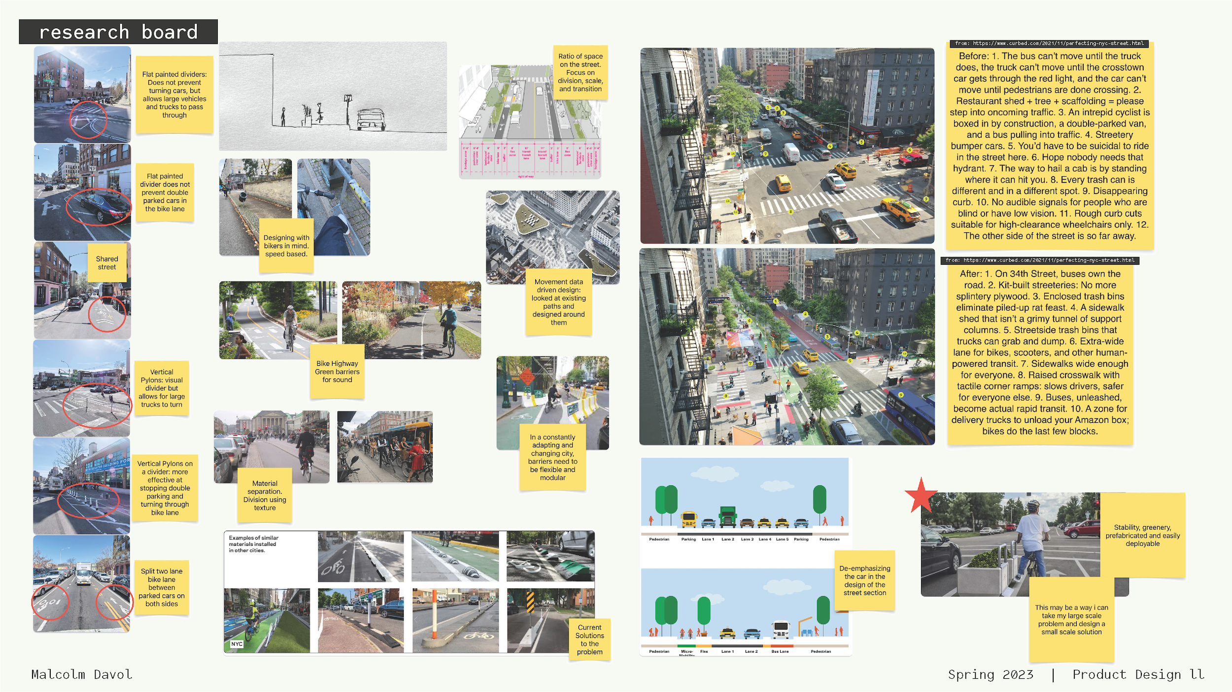 I created a concept and a paper prototype for a modular street dividing system to ensure the safety and comfort of pedestrians, cyclists, and drivers on urban streets. This project explored speed, movement, sound, division, and visibility, and it drew on research, traffic data, and personal experience.