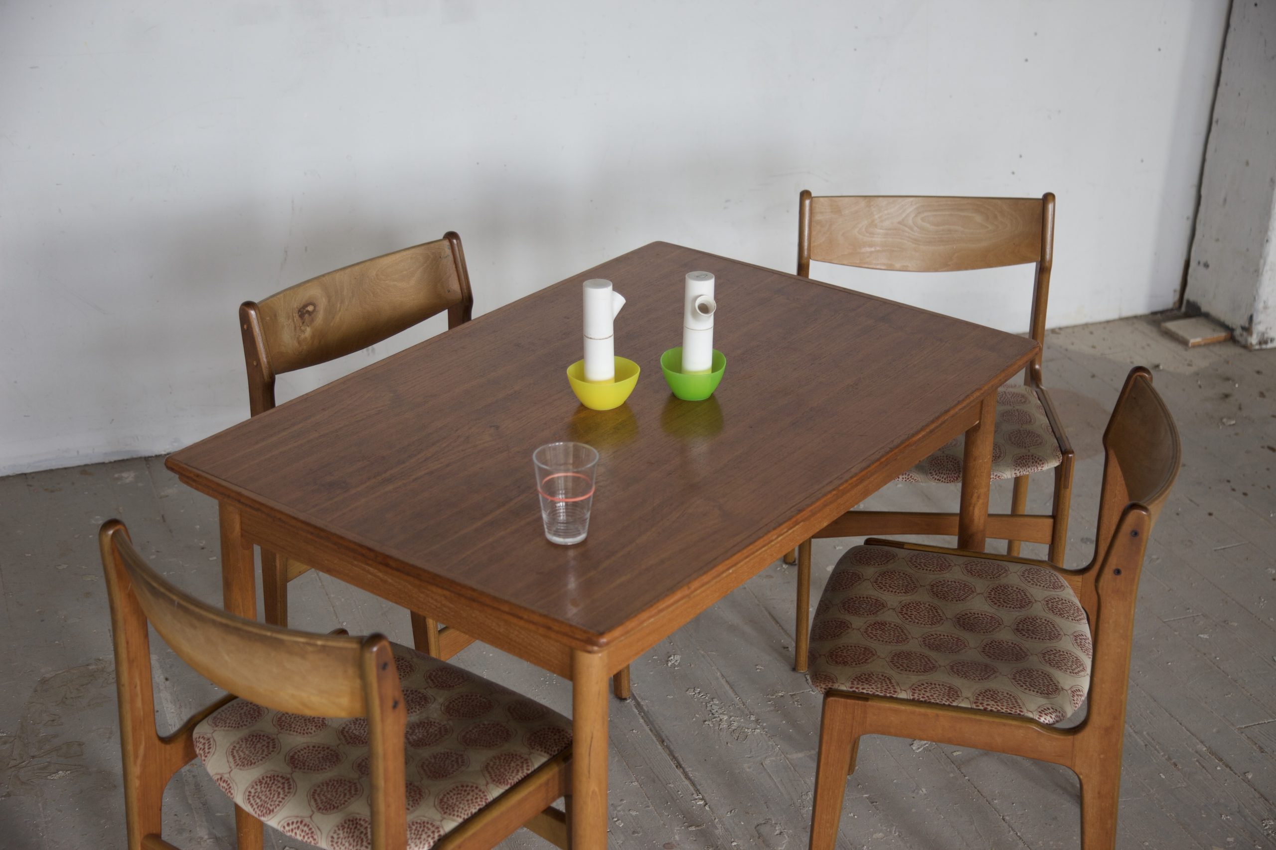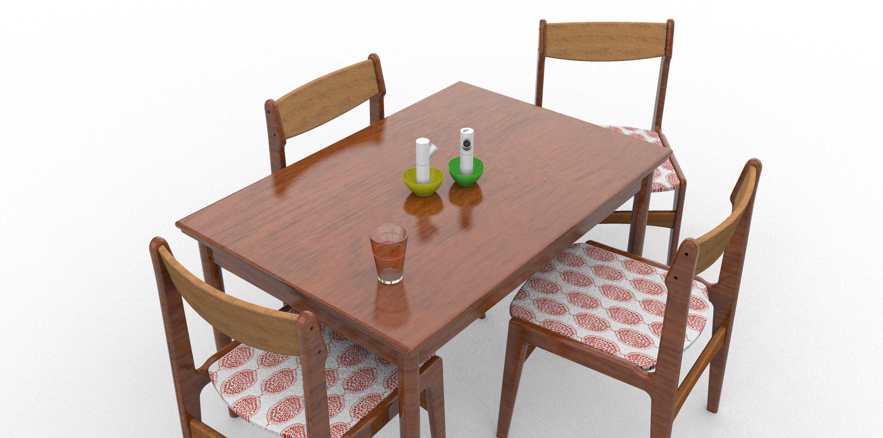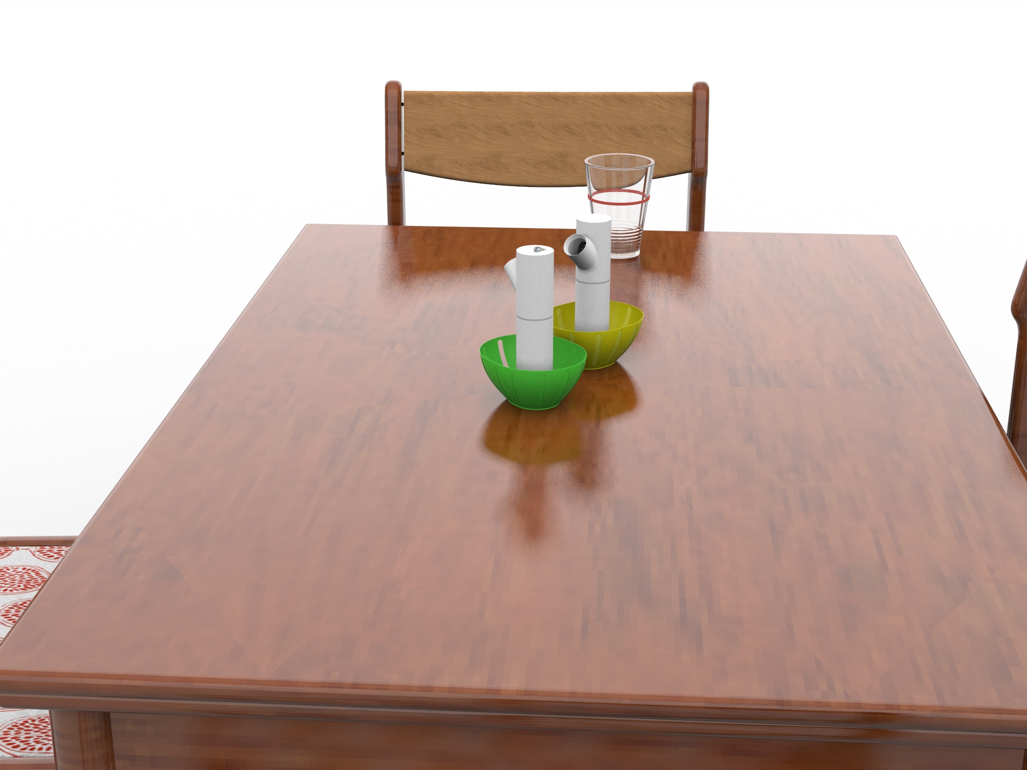 Recreate my family’s dining room table and chairs digitally. Render includes a table, chairs, salt/pepper grinders, Ikea bowls, and a glass with a rubber band around it.