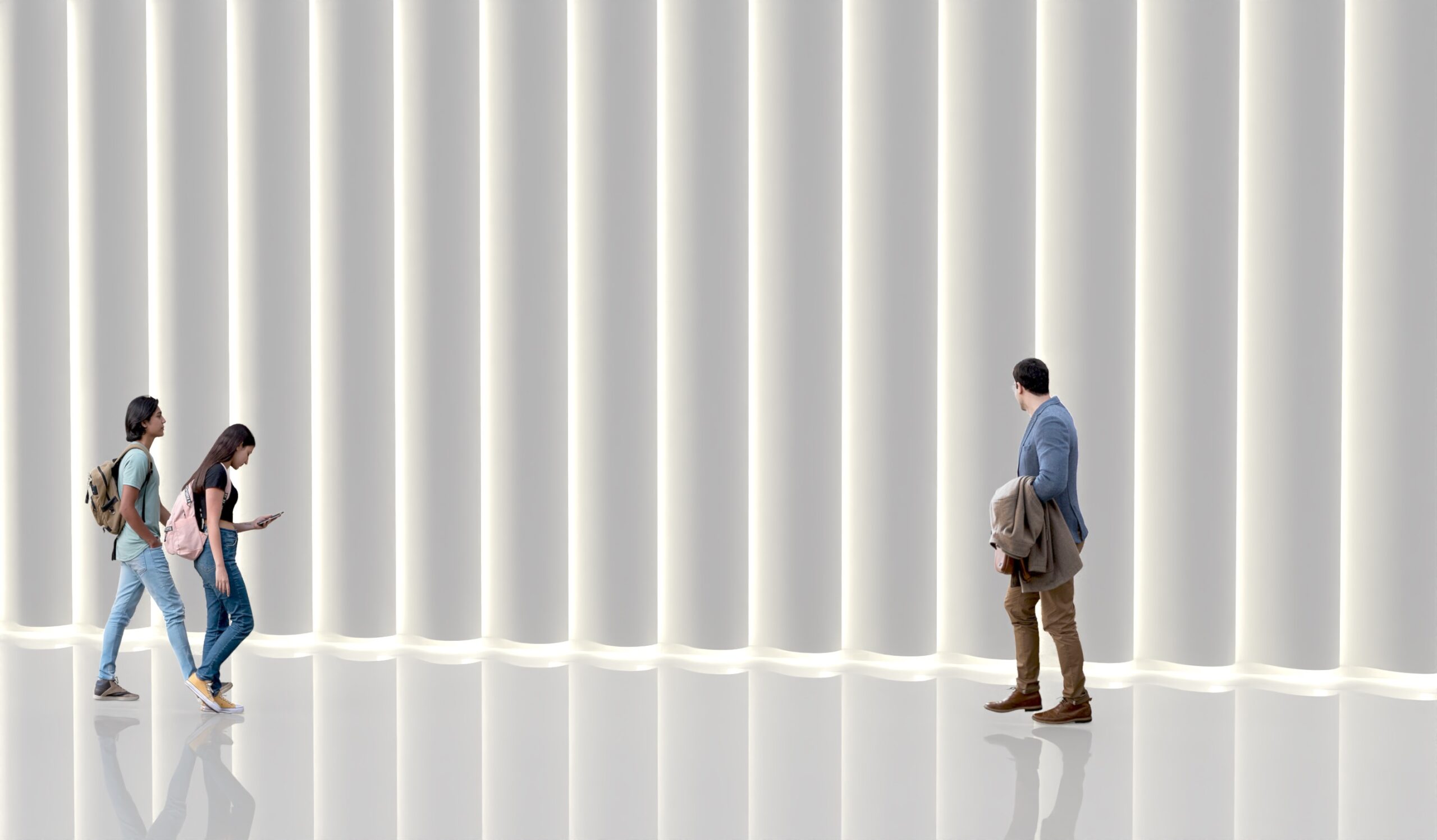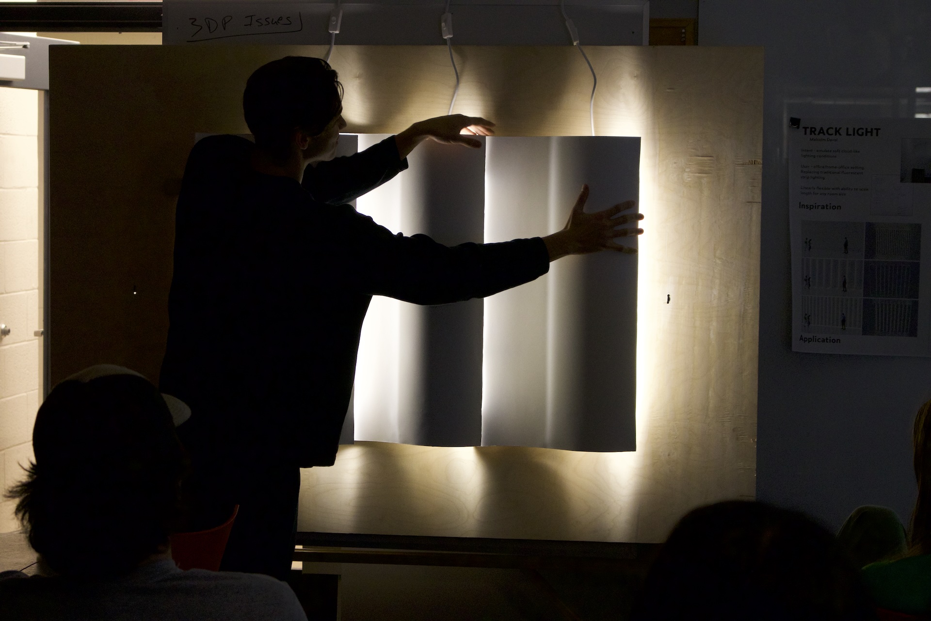 I designed and fabricated a prototype lighting solution for public indoor spaces that creates soft diffused lighting and replicates the effect of window blinds on a bright day. The prototype relied on a flexible, scalable, linear solution that could slide along a rail to allow more or less light to be emitted.